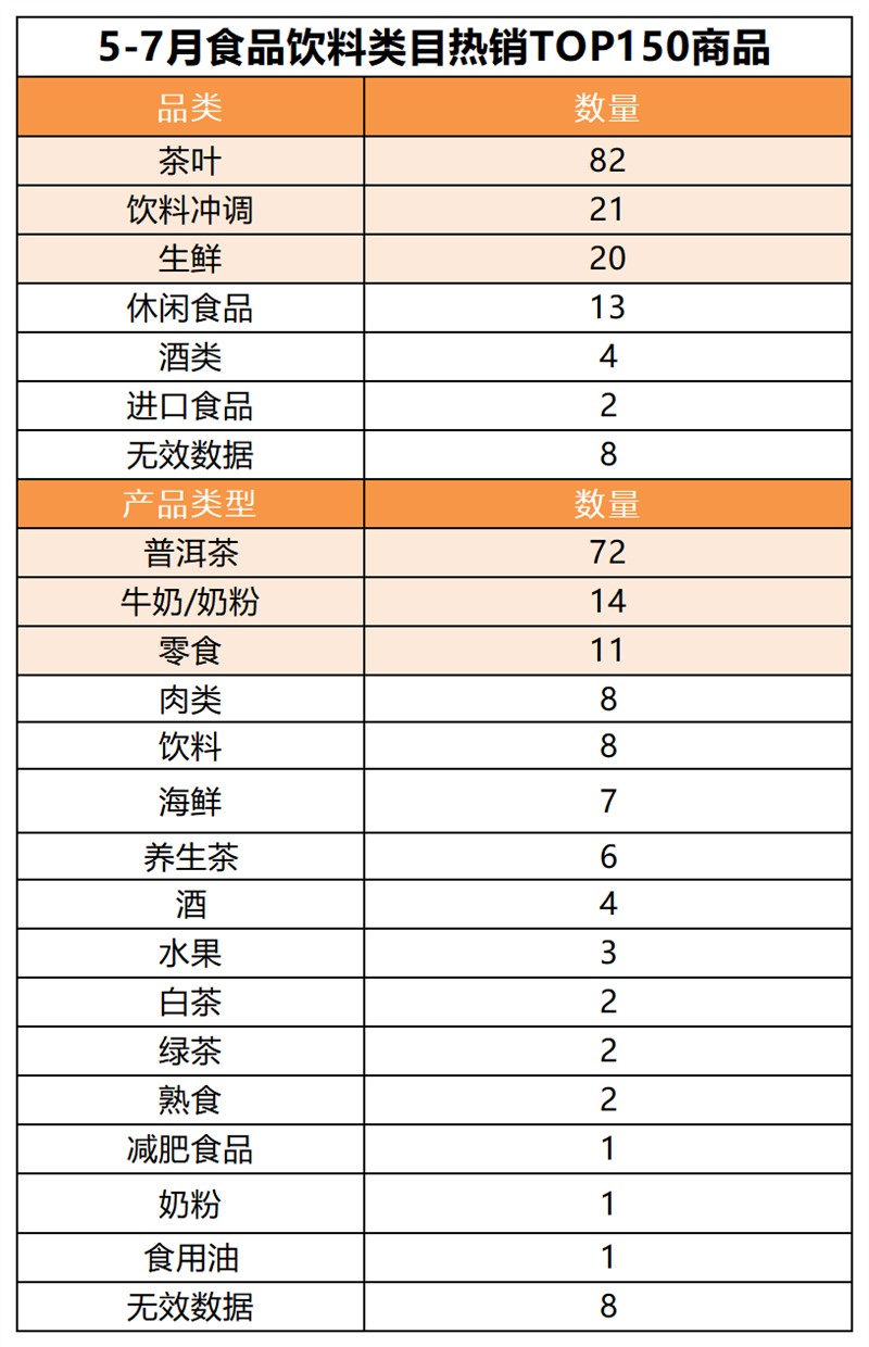 下面是我们总结归纳的5-7月“食品饮料类目”热销TOP150商品数据,如图。